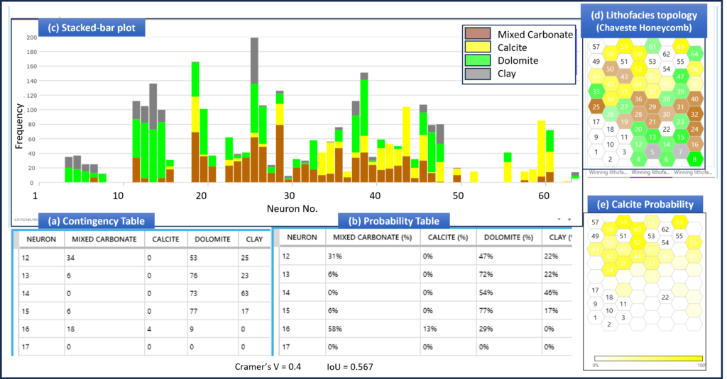 4. Cross-Tabulation: The cross-tabulation of lithofacies and SOM neurons resulted in a contingency table computing the probability of occurrence for each lithofacies within each neuron.